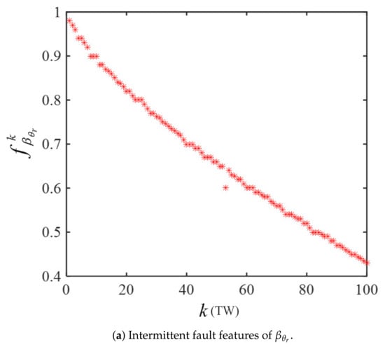 where Q is the number of intermittent fault features in the time interval ; is the instant at which the intermittent fault first occurs; represents the fault feature of in the kth TW; denotes the magnitude of the mth fault appearance in the kth TW for ; the sign “±” is determined by the relation between and ; the sign is “+” when and “−” otherwise; M is the number of fault appearances in the kth TW.