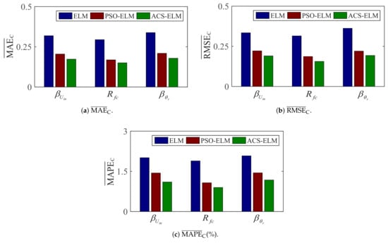 Finally, a comparison study was conducted with traditional ELM and PSO-ELM [] to validate the superiority of the proposed ACS-ELM-based prognosis method. To make a fair comparison, all approaches were tested on the same simulation or experiment data. Additionally, the population size, maximum iterations and search spaces of parameters for three algorithms were the same. Each approach used 30 independent tests (i.e., simulation for and , experiment for ). The mean value of MAE (i.e., ), obtained from 30 tests, was taken as the comparison index of algorithm performance, as were the mean values of RMSE and MAPE (i.e., and ). The comparison results of ELM, PSO-ELM, and ACS-ELM are summarized in Table 6. Meanwhile, the comparison results of the RUL prediction performance for different algorithms are depicted in Figure 11, where the cube roots of , , and (i.e., , , and ) are calculated and illustrated in Figure 11 for observation. According to Table 6, compared with the standard ELM and PSO-ELM, the average prediction evaluation indexes (i.e., MAE, RMSE, and MAPE, respectively) in 30 trials of ACS-ELM were reduced by 83.95%, 81.50%, 83.51% (ELM compared to ACS-ELM) and 39.53%, 36.70%, 54.98% (PSO-ELM compared to ACS-ELM) for , 86.67%, 87.82%, 89.45% and 29.17%, 41.54%, 42.52% for , 85.27%, 84.84%, 81.78% and 38.04%, 32.71%, 45.69% for . It can be concluded that ACS-ELM performs better than traditional ELM and PSO-ELM in terms of RUL prediction under intermittent faults.