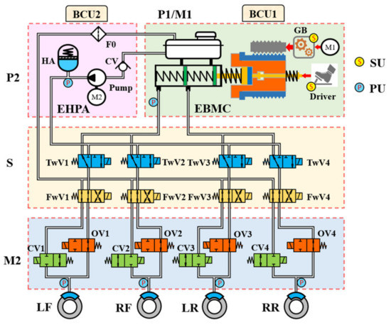 The configuration of the DREHB is shown schematically in Figure 1. The system is composed of three layers, namely the hydraulic power provider (denoted as P1, P2), the hydraulic flow switcher (denoted as S), and the hydraulic pressure modulator (denoted as M1, M2). At the bottom of the figure, there are four-wheel cylinders, abbreviated as LF, RF, LR, and RR for the left/right and front/rear locations.
