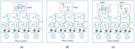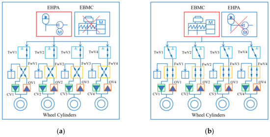 When the DREHB is in the working mode, as shown in Figure 2c, the EBMC and EHPA supply hydraulic power collectively. Additionally, there are multiple possible working modes here, which can be categorized into (1) the EBMC undertakes one channel of wheel brakes, and the other three channels are dependent on the EHPA; (2) the EBMC undertakes two channels of wheel brakes, and the other two channels are dependent on the EHPA; likewise, (3) the EBMC is for three-channel wheel brakes, and the remaining channel is working with the EHPA. As an example, in Figure 2c, the wheel cylinders of the front axle are governed by the EBMC in hydraulic supply and pressure regulation, and the rear-axle wheel cylinders are supplied by the EHPA and regulated by LSVs under hydraulic pressure.