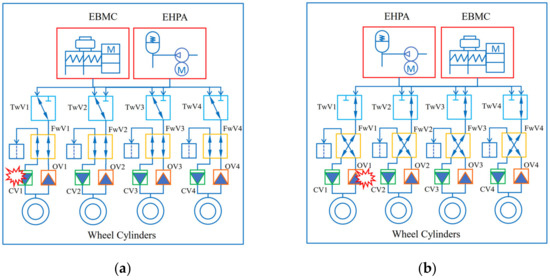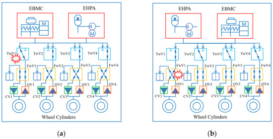 Mode A: As shown in Figure 5a, if a certain channel of the normally closed valve (CV) fails, only the normally open valve (here, OV is used as the inlet valve) of the same channel can be controlled at this time; therefore, the EBMC is selected as the hydraulic power source unit.