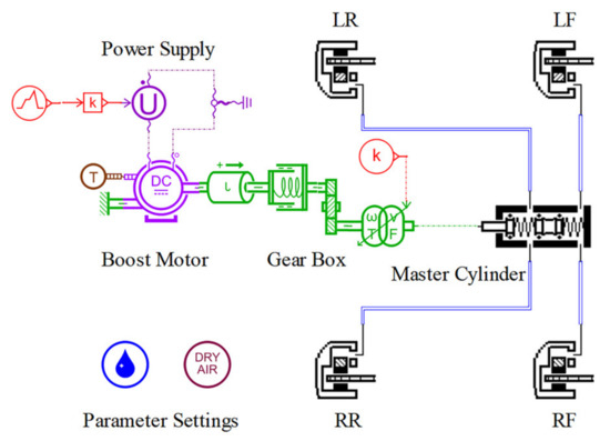 Figure 6 shows the dynamic model of the EBMC with the whole braking system. The exciting signal of the boost motor is a 12.0 V voltage input stepping up and down during a time range of 0.5 to 2.0 s. The gear box with equivalent inertia transfers the rotational motion into the translational motion of the master cylinder piston. The parameter settings of the EBMC in the dynamic model are all based on the mass production parts.
