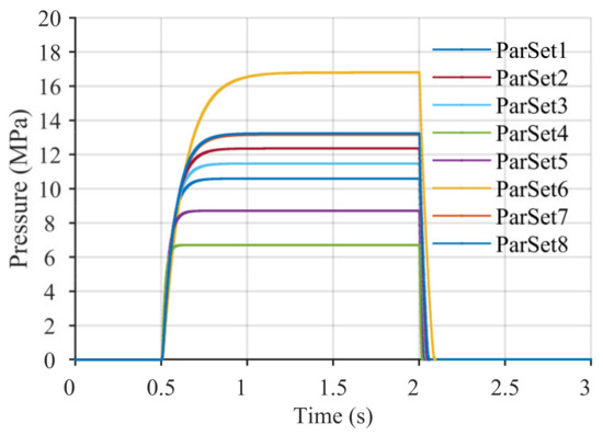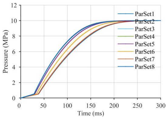 Hydraulic pressure responses of LSVs with batched mechanical parameter sets.