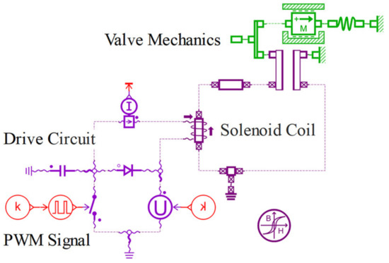 Based on the aforementioned electromagnetism principles, a dynamic LSV with a thorough electrical coil was modeled in AMESim, as shown in Figure 11. The basic elements of drive circuit, air gap, rectifier diode, capacitor, and return spring were used to establish the coil and valve models. The pre-compression of the spring connected with the valvelet mass was used to act as the valve mechanics. The drive circuit of the coil produced the 700 Hz PWM signal, and the battery voltage was 12 V. Six different sets of turn numbers and duty cycles of PWM signals were chosen for the batched simulations. The coil current was selected as the measured physical quantity, and the simulation results are shown in Figure 12.