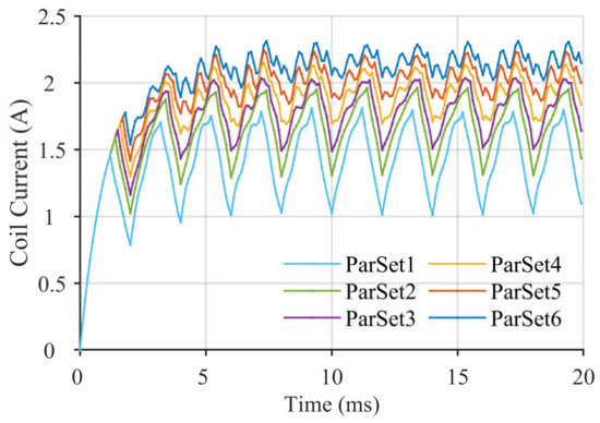 Compared with the traditional ABS and ESC in the automotive industry, the operating frequency of the DREHB solenoid valve has changed to an extremely high probability for normal operations. The drive force of the high-frequency solenoid valve comes from the coil on the top of the solenoid valve. The electromagnetic characteristics of the LSV play an indispensable part in the dynamic behavior of the valvelet dynamics [35]. The current through the solenoid coil generates a magnetic field to push the valvelet actively to control the flow rate. In the midst of the electrical parameters that affect the electromagnetic characteristics of an LSV, it is quite comprehensible that more turns of coil windings will generate a larger electromagnetic force to drive the valvelet. The research [36] indicates that a smoother coil current can result in a better performance in the controllability of the LSV. Hence, the turn number and the coil current of coil windings are selected to be investigated for the optimal electrical parameter set of the LSV.