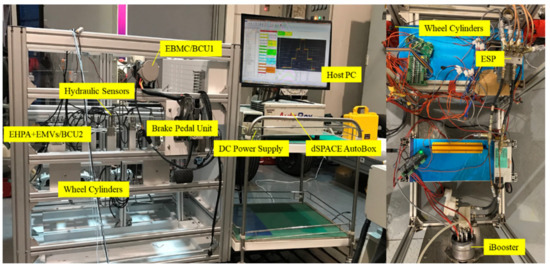 A trial-manufactured DREHB system and four-wheel cylinders are combined together in Figure 13. Note that the two braking control units BCU1 and BCU2 communicating with CAN (Controller Area Network) bus are dually equipped for the supervisory redundancy. The EBMC system corresponds to the sketched one in Figure 13, while the EHPA system is integrated with all the electromagnetic valves (EMVs, here are labeled for LSVs) in the mechanical structure. Hydraulic pipelines are used for the linkage between the EBMC, the EHPA, EMVs, and four-wheel cylinders.
