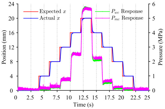 For autonomous electric vehicles, the critical braking demand in real-life driving cycles is the automatic emergency brake (AEB) function for the safety concern. In this case, the input signal was defined as the expected piston position of the master cylinder, and the step signals up and down were assumed to be the continuous sudden brake in different intensity levels of AEB-liked scenarios. The HIL test results of the step wave input of the piston position are depicted in Figure 14.