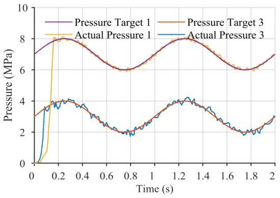 For driving scenarios such as adaptive cruise control (ACC), the ego vehicle will follow the front vehicle by keeping an inner-car distance. That means, the ego vehicle has to accelerate or slowdown in time automatically and precisely. In this case, the autonomous electric vehicle takes the regenerative braking ability of the electric powertrain and distributes the braking forces between the power motor and the DREHB system. Thus, the wheel cylinder pressure must keep the fast and precise tracking performance in complex braking conditions. Moreover, the hydraulic pressure adjustment should be independent among four-wheel brakes to achieve the fully decoupling braking facility in case of anti-lock braking or other extreme braking tasks. Two sinusoidal wave signals were introduced for the front left (denoted by one) and rear left (denoted by three) wheel cylinders’ pressure targets simultaneously. The frequency of both sinusoidal waves was 1.0 Hz, and the average pressure value of the first one was 7.0 MPa, while the second one was 3.0 MPa. Pressure variation ranges of two sinusoidal waves were within 2.0 MPa. The test results are seen in Figure 15.