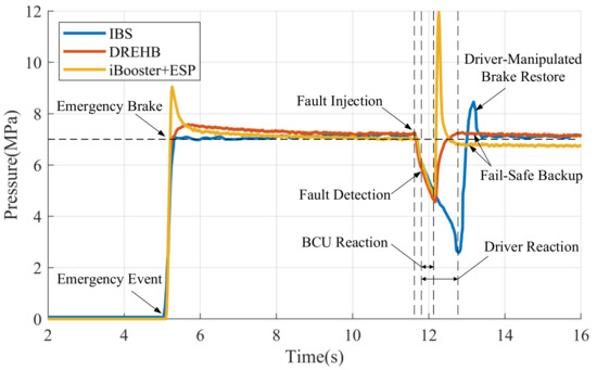 The initiative brake system designed in this research is expected to enable high-safety braking ability, especially for the fail-safe braking scenarios. When a certain failure occurs in the DREHB, the degraded initiative braking modes described in Section 3.2 are dedicated to performing the fail-safe functions by managing the feasible operations among the EBMC, the EHPA and the LSVs. To validate the fault tolerant effectiveness and reliability of the DREHB, the comparative braking test was carried out by three brake systems responding in the scenario where emergency braking is incorporated with an undesirable fault injection. The IBS in the literature [36], the iBooster with an ESP, and the DREHB proposed in this work were chosen for the parallel experiments with the same scenario settings and control targets. The brake control strategy and hydraulic pressure regulation are based on the threshold logic and PID controllers in the Section 5.2.2. Moreover, the hydraulic control logic in the DREHB controller is reused in iBooster and ESP. The test results are shown in Figure 16.