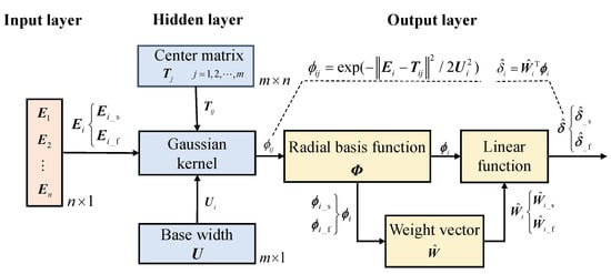 NNs have excellent ability of nonlinear fitting and complex mapping, furthermore, their learning rules are simple and easy to implement on the digital controller []. Radial basis function neural network (RBFNN), as a favorable forward-feedback NN, can approximate any continuous nonlinear function with arbitrary precision, and also features rapid convergence, good adaptation and strong self-learning [,]; thus, it is utilized in this paper as an external factor through feedforward compensation and a class of saturation functions is applied as an internal factor in the reaching law of SMC to help suppress the chattering phenomenon caused by SMC.