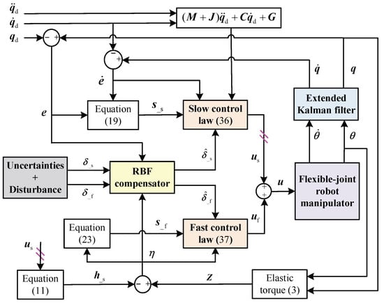 As presented by (8), (36), and (37), inheriting the idea of decomposing the whole dynamics of an n-degree-of-freedom flexible-joint robot manipulator by (1) and (2) into two subsystems in the framework of singular perturbation theory, acts on the slow subsystem (rigid part), while acts on the fast subsystem (flexible part) to depress the influence caused by the joint flexibility. Both sub-controllers are designed with the sliding mode control strategy, where the and involved are obtained from the EKF proposed in Section 5, making the closed-loop control without measuring link states. Moreover, an RBFNN-based error compensator is included in the proposed SMC. The block diagram of the proposed control approach is shown in Figure 2.
