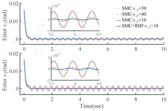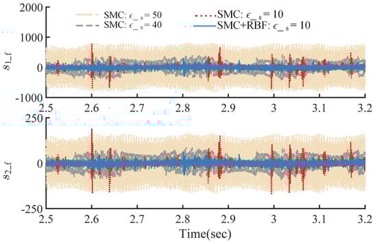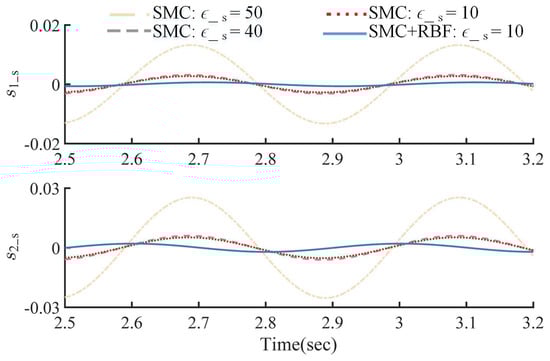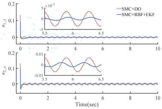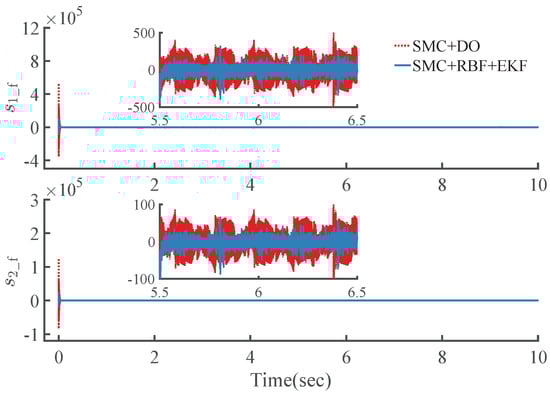 where and are positive definite constant diagonal matrices, is a monotone increasing smooth saturation function with adjustable saturation factor, passing through the origin of coordinate, continuously differentiable. More details can be found in []. Importantly, the smooth saturation function applied retains the fast response characteristics of the most commonly used switching function nearby the origin to ensure sufficient robust performance, as long as the zero-crossing slope is sufficiently large. Theoretically, it can be infinitely close to the switching function by adjusting the saturation factor but avoids discontinuous transition during switching, which is the main cause of chattering.
