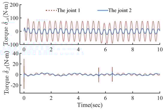 For chattering suppression, refs. [,] designed typical sliding mode controllers (SMCs) as a second auxiliary controller that has switching gains to suppress time-delay estimation errors to achieve robust tracking performance and to weaken the negative effects of chattering. A second-order integral SMC was provided to mitigate the chattering by ensuring finite time convergence in [,]. As an extension, a continuous sliding mode control design was introduced in [] to robotic systems with compliant actuators due to its advantages of strong robustness and chattering attenuation.