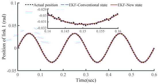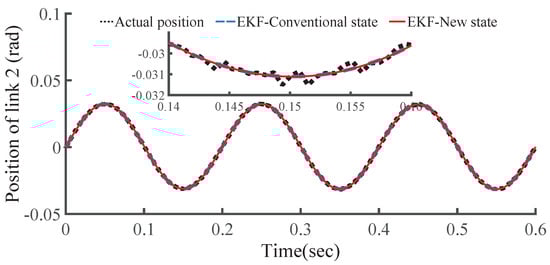 To test the proposed EKF, comparisons to the EKF with conventional state variable [] were made, where the process noise and observation noise to every state variable of each link were assumed to be independent and constant, i.e., , , where is the identity matrix. The initial is set as . In addition, the random noise within amplitude of 0.001 rad is assumed to be mixed in the position observations of each link by the proposed EKF with new state variables. The trajectories of two links to be observed are given as