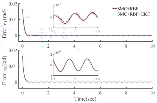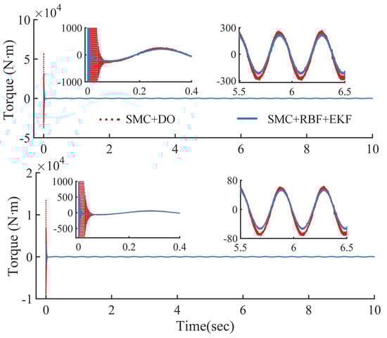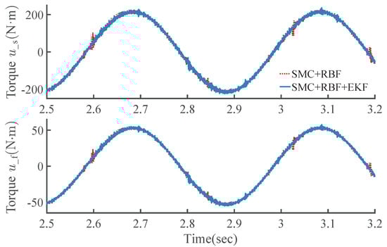 The RMS values of the two EKF observers are very close to each other, both of them are qualified to implement the observation with nearly equal dynamic performance. The computation period is shortened from 6.8 to 5.0 ms, and the efficiency increased by about 26%. That is, the proposed EKF is more efficient and requires a shorter computation period, but without sacrificing the observation accuracy. Such a result was confirmed by large amounts of tests with other different trajectories. As shown in Figure 10 and Figure 11, the controller involving the EKF-New state (named as SMC + RBF + EKF) can achieve almost the same control performance as the controller SMC + RBF, and it can also alleviate the torque vibration caused by chattering to a certain degree.