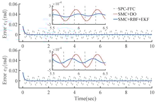 As shown in Figure 12, Figure 13, Figure 14 and Figure 15 and Table 2, with the feedforward torque compensation caused by the proposed RBF compensator based on tracking error, the proposed controller SMC+RBF+EKF cannot only achieve superior performance similar to that of the controller SMC+DO, but also can improve the dynamic performance of the control system, with shorter adjusting time and recovery time, and smaller maximum deviation, steady-state error and RMS value, as well as better chattering attenuation. Furthermore, state measurements of links are eliminated.