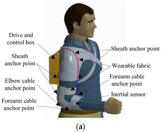 As shown in Figure 1a, the elbow exoskeleton designed in this paper is composed of an actuating control box and a wearable part. The actuating control box (Figure 1b) mainly includes two nonlinear cable SEAs, two motor controllers, a central controller, and a battery. The force transmission path of the cable SEA is arranged along the tension line of the upper arm flexion and extension muscles. The torque of the two SEAs acting on the human elbow joint corresponds to the resultant torque of the flexion and extension muscles, respectively. The starting and ending points of the driving cable are determined based on the human anatomical model and are arranged near the starting and ending points of the assisted muscles. The wearable part includes wearable fabric, cable, sheath, anchor points and inertial sensor (Figure 1a). The anchor points and sheath are fixed on the surface of wearable fabric to guide the cable to move along the designed driving path. The inertial sensor is to measure the elbow angle.