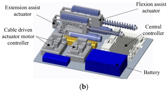 Schematic diagram of cable driven flexible exoskeleton. (a) Overall structure diagram. (b) Schematic diagram of actuating control box.