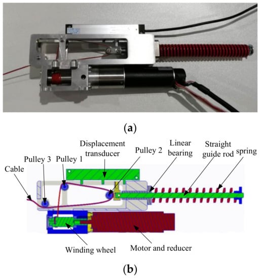 The cable drive mechanism in Figure 1 adopts the principle of series elastic actuating, which realizes force control without adding a force sensor. As shown in Figure 2a, the nonlinear series elastic cable actuator includes a motor, a planetary reducer, a winding wheel, a cable, a linear guide rod, a linear bearing, a linear compression spring, and three pulleys. The winding wheel is directly connected to the reducer output rotating shaft, and the motor’s rotation torque is transformed into the cable’s force through the winding wheel (Figure 2b). The linear spring passes through the linear guide rod. One end of the linear guide rod passes through the linear bearing and connects with the pulley twp, and they connect with a linear displacement sensor. The motor in the actuator is CBL2453-2423f motor from TECHSERVO company, and it is equipped with a gear reducer. The rated output torque of the motor is 27.28 mNm, and the reduction ratio of the reducer is 100. The KSF50 of Miran company is selected as the linear displacement sensor, which is based on the principle of potentiometer. Its stroke is 50 mm, and its linear accuracy reaches 0.1%.