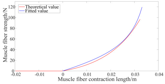 According to the classical Hill muscle model (Appendix A), muscle contraction force includes both an active contraction force and passive contraction force. The simulation of the active contraction force can be realized by the active control of the motor, so that the relationship between the active contraction force and displacement of the cable driving mechanism conforms to the Hill muscle model. The passive contraction force increased exponentially with the increase of muscle fiber contraction length [35]. According to the characteristic curve of muscle passive contraction force in Figure 3, when the muscle length is less than the rest length (the elbow flexion angle is about 60°), there is no passive force. The cable actuator is designed so that there is no output displacement when the elbow flexion angle is about 60°. When the elbow flexion angle is greater than 60°, due to the unidirectional force transmission characteristics of the cable actuator, there is no output force on the cable. When the elbow flexion angle is less than 60°, the nonlinear stiffness characteristics of the cable actuator are fitted with the force-displacement characteristics of the muscle stretch by optimizing the parameters in the actuator.