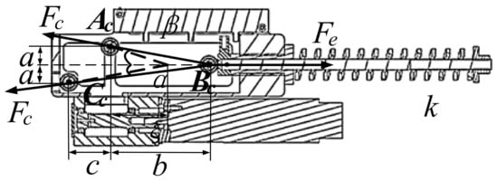 As shown in Figure 4, let the centers of the three pulleys be points AC, BC and CC, respectively, and ignore the friction here. Assuming that the cable force at the pulley AC and CC is FC, and the spring force at the pulley CC is Fe. Let the initial vertical distance between ACBC be b, the vertical distance between ACCC be c, the horizontal distance between ACBC and the horizontal distance between ACCC be a, and the angle between the connecting line of BCCC and the vertical line be α. The angle between ACBC line and vertical line is β. After spring compression, the real-time vertical distance between ACBC points is ξ, and the value range of ξ is [0, b]. The elastic coefficient of the spring is k. According to the force analysis of the cable SEA in Figure 4, the cable force FC can then be deduced as follows: