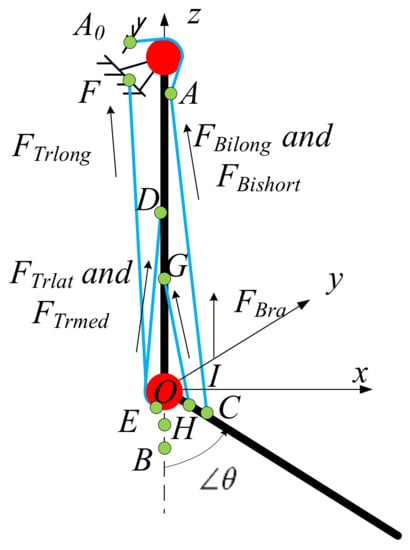 In Figure 6, the origin O is the rotation center of elbow joint, and the coordinate system O-xyz is established. A0 is the starting point of long head and short head of biceps brachii, B is the insertion point of biceps brachii, and C is the position after rotation of B. Since the biceps brachii is a double joint muscle, in order to eliminate the influence of shoulder joint movement on the length of biceps brachii, we assume that the shoulder joint is fixed, an additional point A is set as the starting point of biceps brachii, and the length from A0 to A is regarded as constant when the elbow joint moves. A is used to calculate the muscle length change. D is the starting point of medial head and lateral head of triceps brachii. F is the starting point of long head of triceps brachii. E is the common insertion point of three muscles of triceps brachii, and it is always on the red circle. The red circle represents the trochlear of humerus. G is the starting point of brachial muscle, H is the insertion point of brachial muscle, and I is the position after rotation of H point. θ is the elbow flexion angle. FBilong and FBishort represent the strength of long head and short head of biceps brachii respectively. FTrlong, FTrlat and FTrmed represent the muscle strength of long head, lateral head and medial head of triceps brachii, respectively. FBra represents the muscle strength of brachial muscle.