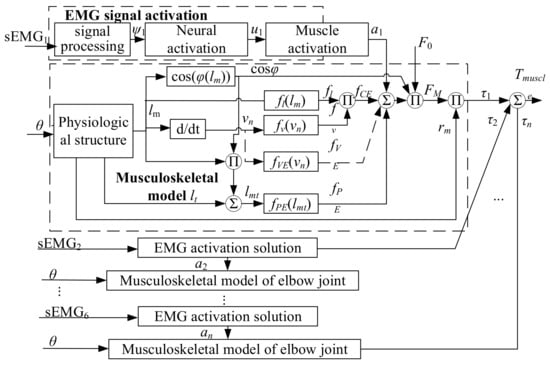 Based on the above anatomical model, combined with the classic Hill muscle model (Appendix A), the elbow muscle torque prediction process is shown in Figure 7 [36], and it is briefly described below. Firstly, the sEMG signals of six muscles were processed to get the muscle activation a1. Then, according to the joint flexion angle θ, the real-time muscle fiber length lm, tendon length lt and muscle force arm rm were obtained using forward kinematic analysis. The cosine of the pinnate angle φ can be obtained from lm, and the normalized muscle fiber contraction velocity vn can be obtained by deriving lm. By lm, cosφ and lt, muscle real-time length lmt can be obtained. Finally, according to Hill muscle model, the muscle fiber length influence factor fl can be obtained from lm. According to vn, the influencing factor of muscle fiber velocity fv is calculated. According to a1, fl and fv, the active coefficient fCE can be obtained, the damping coefficient fVE can be obtained from vn, and the passive coefficient fPE can be obtained from lmt. The sum of fCE, fVE and fPE is calculated, and then the muscle strength FM is obtained by multiplying the cosine value of feather angle cosφ and the maximum muscle strength F0 of muscle fiber. The muscle strength FM is multiplied by rm to get the torque τ1 produced by the muscle in the joint. In this prediction model, the sEMG signals of muscles can be obtained by arranging muscle electrodes on the surface of related muscles, and the elbow rotation angle can be obtained by installing inertial sensors on the forearm. By analogy, we can calculate the torque of the other five muscles in the elbow joint. The resultant moment of elbow joint muscle Tmuscle will be obtained.