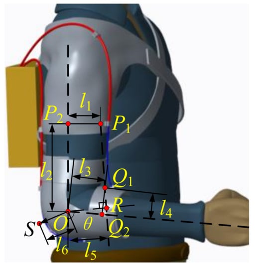 Since the assist torque is finally provided by two cables, it is necessary to decompose the assist torque command Tassist into the force command of two cable actuators. First of all, it is necessary to obtain the flexion arm rB and the extension arm rT of the two cable actuators, respectively. Figure 8 is the geometric analysis diagram of flexible exoskeleton. P1 and Q1 are the cable sheath anchor points and forearm cable anchor points, P2 and Q2 are the vertical points from the above anchor points to the limb axis, and O point is the rotation center of elbow joint. It can be seen from Figure 8 that l5 is the flexion assist force arm Rb and l6 is the extension arm Rt. Since the force arm in the extension direction of elbow joint is basically constant in physiological structure [37], the length of l6 can be regarded as fixed, while l5 needs to be solved.