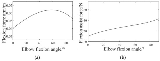 In Figure 9a, the exoskeleton flexion force arm is calculated according to Equation (9) when elbow joint flexing from 0 to 90 degrees. The initial coordinates of P1 are (0.040, 0, 0.200), and the initial coordinates of Q1 are (0.040, 0, −0.050). It can be seen from the figure that the cable flexion force arm first increases and then decreases. It peaked between 50°and 60°. In Figure 9b, the force on the flexion assist cable actuator can be obtained by using Equation (10). The force on the flexion assist cable increases with increasing of the elbow flexion angle. When the elbow flexion angle reaches 90°, the flexion cable force reaches the maximum, about 42 N.