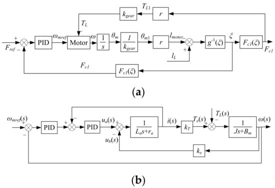 As shown in Figure 10a, the system block diagram of the force control of the nonlinear cable SEA in this paper is presented. According to the compression amount of the spring, the cable force Fc1 can be obtained according to Equation (16). After the error between the force command Fref (FB and FT, which have been gotten before) and the end force feedback Fc1 passes through the PID controller, the motor speed command ωref is obtained. The motor output angular displacement θm is obtained by integrating the speed. After passing through the gearbox, the angular displacement of the winding wheel is θm1, the cable displacement is lmotor. As shown in Figure 10b, the motor adopts double closed-loop control with speed outer loop and current inner loop.