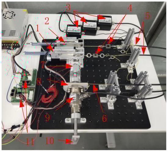 Schematic diagram of experimental platform. 1, extension side cable SEA; 2, flexion side cable SEA; 3, signal converter of tension sensor; 4, tension sensor; 5, cable sheath; 6, cable at drive end; 7, angle sensor; 8, rotating disk; 9, torque sensor; 10, load arm; 11, motor driver.