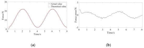 Firstly, the force control of the cable SEA is verified. The end of the nonlinear cable SEA is fixed, the sine force control command is given by the controller, and the force on the cable is collected by the force sensor. After fitting the test data, the shape parameter u in Equation (15) is −0.4077, v is −0.603, and w is 0.247. As shown in Figure 13a, it is the experimental result of sinusoidal force following of nonlinear cable SEA, in which the amplitude of input force command is 22 N and the period is 4 s. Figure 13b shows the tracking error of sinusoidal force command, in which the initial error is relatively large since the extension cable actuator is loaded to the preset force of 2.5 N at the beginning. Then the error changes periodically, and the peak value is within 1.5 N. It can be seen from Figure 13 that there is a good force following effect on the period of 4 s. Due to the slow movement of the elderly wearer, it can meet the requirements of the exoskeleton on the force control bandwidth.