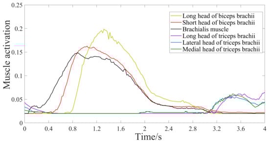 Then, the AAN force control method is verified by experiments. In this paper, the sEMG signals of six muscles in musculoskeletal model shown in Section 3 were not actually collected. Instead, the open-source biomechanics simulation software OpenSim4.1 was used to obtain the sEMG signals under the specified motion state (elbow joint moved from 0° to 90° and then back to 0° within 4 s, and the hand load was 0 kg). After processing, the corresponding muscle activation was obtained as the input of elbow muscle torque prediction module (as shown in Figure 14).