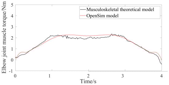 According to the method described in Section 3, the elbow muscle torque is predicted as shown in Figure 15. As can be seen from the figure, the maximum output muscle torque of the elbow joint is no more than 3 Nm. The solid line in Figure 15 represents the torque calculated by the musculoskeletal model in this paper, and the dotted line represents the torque calculated by OpenSim. After analysis, the Pearson correlation coefficient and p-value of the torque-time curve data under the two models are 1.390 and 0.239, respectively, indicating that the elbow musculoskeletal model established in this paper can predict the elbow muscle torque well.