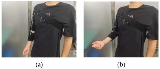 Flexible exoskeleton wearing experiment. (a) Extension state. (b) Flexion state.