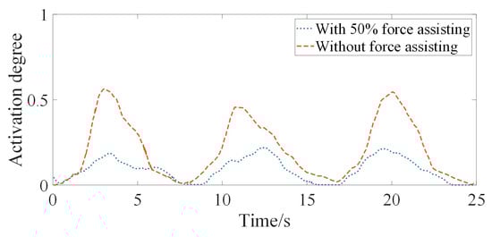 Figure 19 is the activation degree of surface EMG signals of biceps brachii at 50% assistance level and without assistance. As can be seen from Figure 19, the activation degree of surface EMG signal of elbow flexor biceps brachii decreased significantly at 50% assistance level compared with without assistance, which preliminarily verifies the correctness of the AAN control method designed in this paper.
