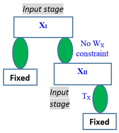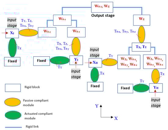 Each of the two input stages for actuation in the same direction can also be interconnected using a compliant module, as shown in Figure 2 [30]. Two examples of the interconnection constraint are shown in Figure 3.