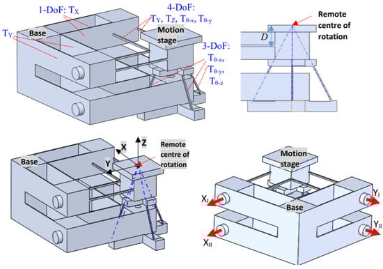Because compliant parallel manipulators have many advantages, such as eliminated backlash, simplified manufacture, and low parts count [25,26,27,28], this study aimed to design a 4-DoF parallel manipulator for an FSM using compliant mechanisms. In order to simplify high-precision control in parallel manipulators, maximum kinematic decoupling was pursued in this study.