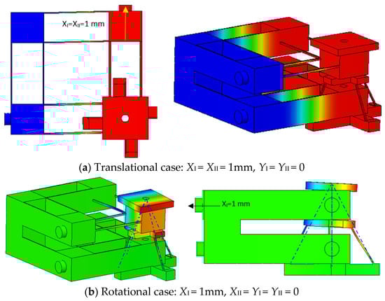 Finite element analysis (fine meshing) is used to simulate the compliant manipulator with the main parameter D = 15 mm (Figure 4). The qualitative simulation results in two actuation scenarios, and a 3D-printed prototype, are shown in Figure 5. For the actuation scenario as shown in Figure 5b, XI = 1mm and XII = YI = YII = 0, and we can see the clear difference between the ideal and simulation results in Table 1 and Table 2, indicating the kinematic coupling and the parasitic motions in the two constrained directions of the motion stage.