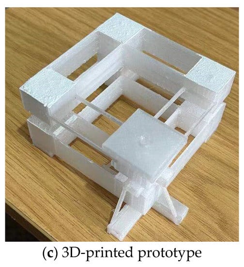 Simulation results and the prototype of the proposed 4-DoF compliant parallel manipulator: (a) translational case: XI = XII = 1mm, YI = YII = 0, (b) rotational case: XI = 1mm, XII = YI = YII = 0, and (c) 3D-printed prototype.