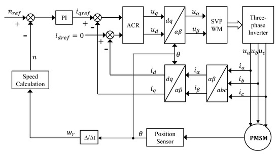 The structure of the PMSM vector control system is given in Figure 1. The system adopts a double closed-loop control structure with an internal current loop and an external speed loop. The position information detected by the position sensor is converted into the motor speed and compared with the reference speed to get the deviation number. This deviation signal is passed through the speed PI regulator to obtain the current torque component reference , and the stator current excitation component . The stator three-phase currents measured by the phase current detection circuit are converted to in the d-q coordinate system as the current loop feedback quantity through coordinate transformation.