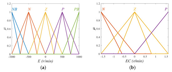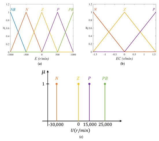 Here, we mainly describe the design of T1FLS. Figure 8a,b, respectively, display MFs of input variable E and , and Figure 8c shows MFs of output variable U.