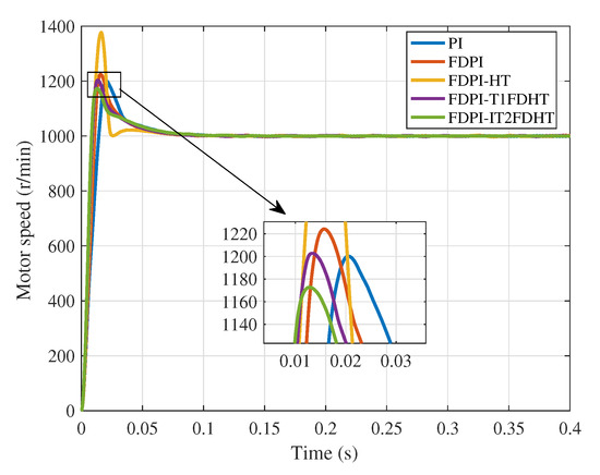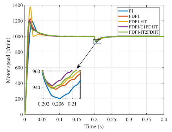 In Figure 12, it can be seen that compared with other methods, FDPI-IT2FDHT has the smallest overshoot and the fastest adjustment time, followed by FDPI-T1FDHT, and the worst is PI, which proves the importance of the FLS. It has been analyzed that the simple high type structure will increase the system vibration and increase the overshoot, but at the same time it will also reduce the adjustment time. Therefore, the high type structure sacrifices the overshoot in exchange for rapidity, just like the FDPI-HT simulation here. Furthermore, in Table 8, among the five methods, FDPI-IT2FDHT has the smallest evaluation index results in the no-load case, which indicates that the method performs well in all aspects. It is worth noting that the ITSE and ISE values for FDPI-HT (bolded in Table 8) are larger than those for FDPI. By analysis, this result may be caused by the excessive overshoot of FDPI-HT. However, it is its shortcomings in this respect that allow us to introduce the FLS to improve the method.