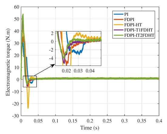 To better compare several methods, Figure 13 shows the electromagnetic torque response results in the no-load case. With the help of this figure, the superiority of the FDPI-FDHT methods, especially FDPI-IT2FDHT, can be more clearly demonstrated.