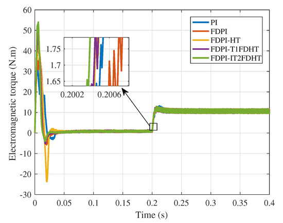 To add variety to the comparison, the electromagnetic torque response curves under load conditions are given in Figure 15. There is no doubt that the FDPI-IT2FDHT is the fastest to track on the given torque when the load torque is added at 0.2 s, followed by the FDPI-T1FDHT, which indicates that by adding the high type structure and FLSs, the system has shorter adjustment time, faster to reach the given speed, smoother overload when adding load suddenly, and better tracking ability to the load.
