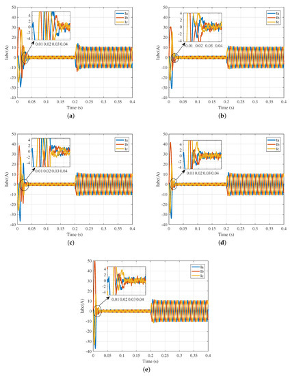 Three-phase current variation curves. (a) PI; (b) FDPI; (c) FDPI-HT; (d) FDPI-T1FDHT; (e) FDPI-IT2FDHT.