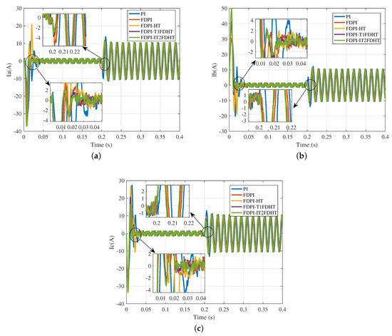 In order to demonstrate more clearly the three-phase current variation of these five methods, a comprehensive comparison of each of the three currents is performed. Figure 18 displays the current variation of Ia, Ib, and Ic with each of the above five strategies. According to this figure, regardless of the current, the PI stator current takes the longest time to reach a sinusoidal wave at no-load start-up, adding voltage decoupling compensation shortens this time for the FDPI, and adopting a high type structure makes the time much shorter and the response speed faster. However, this rapidity is traded off by increasing the jitter before entering the steady state. In turn, FLSs are introduced to improve performance across the board. It is clear from the enlarged diagram the methods with fuzzy dynamic high type structure (FDPI-T1FDHT and FDPI-IT2FDHT) can enter the steady state faster whether under no load or with load.