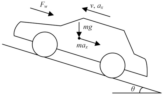 Newton’s second law is applied to establish the vehicle longitudinal dynamics model. As shown in Figure 1, the longitudinal forces acting on the vehicle are expressed as the acceleration, rolling, gravitational, and drag [4]. The longitudinal dynamics equation is shown in Equation (1).
