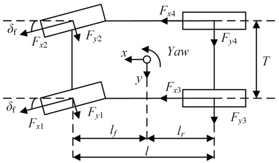 In this paper, the longitudinal, lateral and yaw motion of vehicle are considered, and the pitch, roll and vertical motion of the vehicle are neglected. The simplified four-wheel vehicle dynamics model [14] is established as shown in Figure 2, where Fxi and Fyi are the longitudinal and lateral forces of the four wheels respectively, and the subscript i is 1, 2, 3, and 4, representing the front-left, front-right, rear-left and rear-right wheel respectively; δf is the front wheel steering angle, lf and lr are the distance from vehicle gravity center to the front axle and rear axle, respectively; l is the wheelbase, and T is the track width. The longitudinal, lateral and yaw motion are presented as follows:
