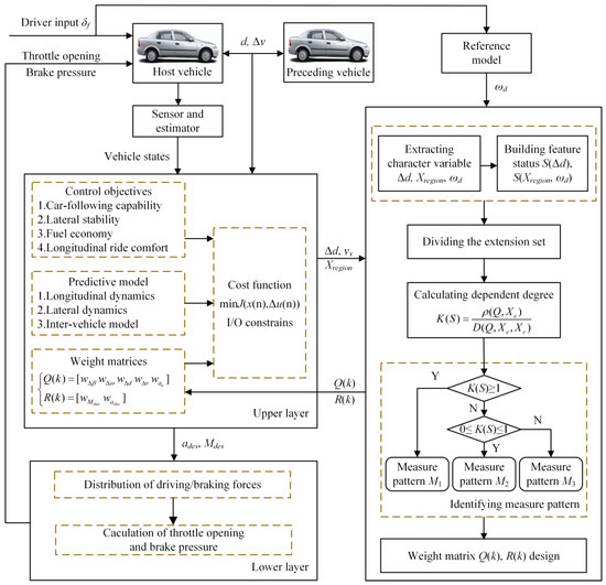 Extension control is developed from the extension theory founded by Wen Cai. It is a new type of intelligent control that combines extenics and control. It can imitate people’s ability to summarize, study and solve the incompatible issue [16]. Its basic idea is to deal with the control problems from the perspective of information conversion. In other words, the qualified degree (dependent degree) of control input information is used as the basis to determine the correction value of control output, then the controlled information will be converted to the qualified range [17]. Extension control is a cross-discipline method which has been applied into various engineering control domain. Currently, the extension control has also been applied into vehicle stability control [18,19,20], and these studies showed that the extension control could improve the performance of control system effectively. In this paper, the extension control is used to supervise the control effect of longitudinal car-following distance error and the risk of losing vehicle lateral stability and then adjust the weight matrix in the MPC framework.
